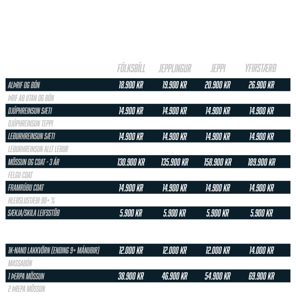 Veldu stærðarflokk Fólksbíll Jepplingur Jeppi Yfirstærð Bóka núna Hvernig virkar þjónustan á Leifsstöð 1. BÓKA Þú bókar þrif fyrir bílinn efst á síðunni okkar. 2. MÆTA Þú hringir í þjónustu símann okkar 20 mínútum áður en þú mætir upp á flugvöll. 3. HEIMKOMA Þú hringir í þjónustu símann okkur um leið og þú lendir og við afhendum þér bílinn brottfaramegin. Umsagnir Bóka núna Fólksbíll Jepplingur Jeppi Yfirstærð